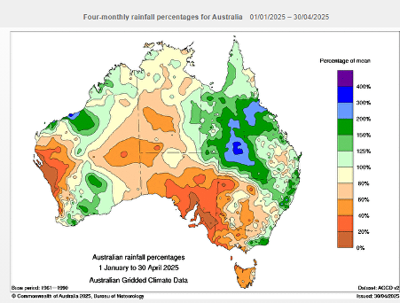 Parts of SA, VIC and Tasmania (TAS) have endured their driest start to a year on record as a lack of early Autumn rain worsened drought conditions in parts of all three states. High pressure systems have been dominating the weather patterns near southern Australia in recent months. These stubborn areas of high pressure have prevented any substantial rainfall from reaching large areas of SA, VIC and TAS since the start of 2025. The map below shows the rain that fell across Australia in the first four months of 2025 represented as a percentage of the long-term average. The brown shading shows where rainfall was less than 20 percent of the long-term average for the January to April period. Dry weather is also a concern for the Geraldton zone in WA. Forecasts remain dry for at least the next 10 days.
