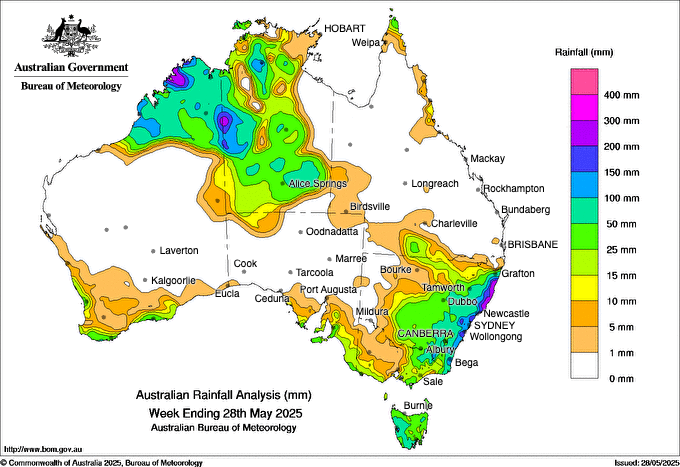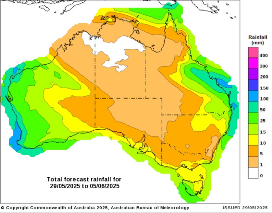 Southern NSW received welcome rain in the past week and Adelaide and the Hills also received good amounts of rain (the best in nine months) with most of the rest of SA receiving around 10-14 mm. Tropical moisture is building across northern WA, and this pattern will influence the weather across much of Australia throughout the week. This is expected to see more rain in Queensland (QLD) and NSW through the week. Southern WA will see a cold front later in the week which is expected to result in cropping areas showers on the weekend. The big question is how much rain SE Australia will see. Weather models aren’t forecasting any significant rain for SA and VIC cropping areas this week but are offering a better chance in the following week and into June. The model accuracy is significantly lower the further out we go. The good news for southern Australia is the lows are now hitting the mainland, whereas before they have been much further south in the Southern Ocean.