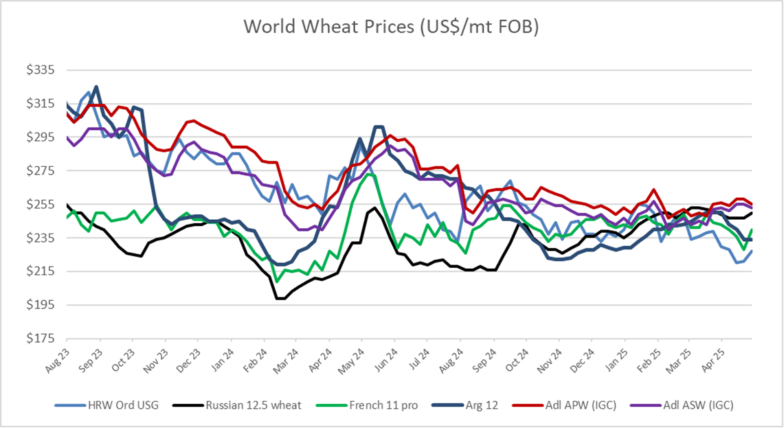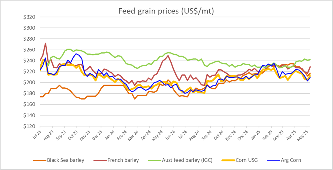 Rain in New South Wales (NSW) and more general rain in the forecast for this week and into June resulted in a flurry of activity in the Australian domestic grain markets over the last week. Wheat and barley sellers emerged which put some pressure on prices particularly for those slots that are starting to compete with northern hemisphere new crop positions. The changes in price were relatively small as the strength of the AUD took out some of the benefit.