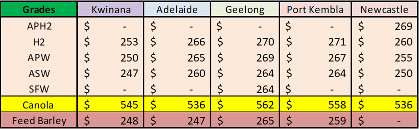 There was 518 thousand metric tonne (KMT) of wheat added to the stem in the past week. All of this was in Western Australia (WA). It included 268KMT in Kwinana, 150KMT in Geraldton and 50KMT each in Esperance and Bunbury. There was also 300KMT of barley put on the stem in the past week with 195KMT of this in WA as well as individual cargoes in South Australia (SA) and Victoria (VIC). A further 51KMT of canola was put on the stem in VIC.