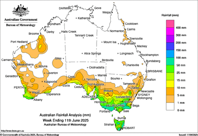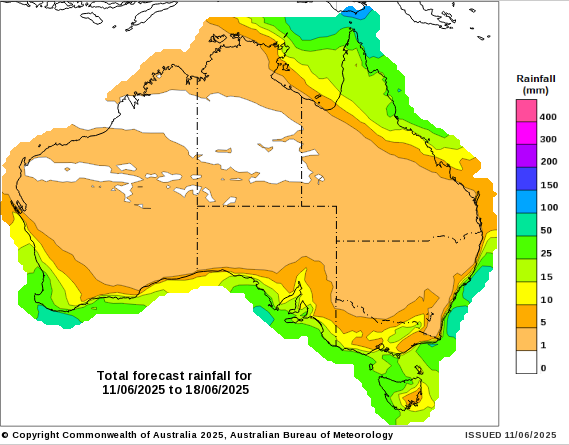 ABARES issued its June crop report early last week which offered its initial 25/26 production estimates. ABARES flagged the varying crop conditions across the country with the extremely dry weather in Southern NSW, VIC and SA. This means that much of the 2025/26 winter crop has been dry sown and will require adequate and timely rainfall during June to allow for crop germination and establishment. By contrast, conditions have been favourable in Queensladn (QLD), Northern NSW and Southern Western Australia (WA), reflecting the above average early autumn rainfall.