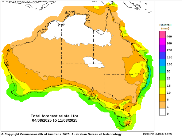 Widespread rain capped off a wetter-than-normal July across key cropping regions. This has helped turn around winter crop outlooks, with wheat production now expected to reach 34+MMT and barley 13.5MMT. The Bureau of Meteorology's latest seasonal outlook (Aug–Oct) continues to forecast above-average rainfall for most of mainland Australia, excluding the far west and southeast. This bodes well for 2025 winter crops, particularly in northern NSW and southern QLD where timely planting rains have boosted confidence. Crops in southeast Australia, which had a late and slow start, are also benefiting. WA crop conditions have improved, but subsoil moisture remains below average—making follow-up rainfall critical for yield potential.