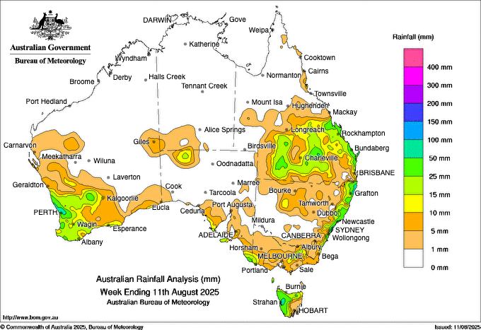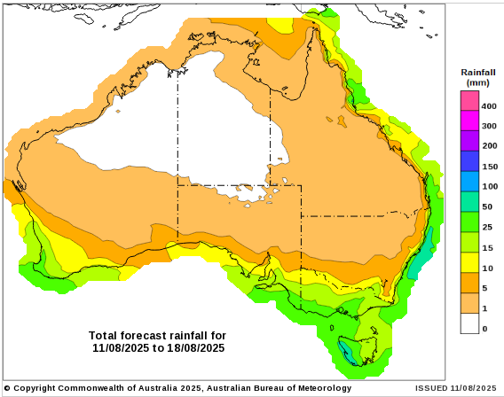 There has been improving sub-soil moisture profiles across Australia’s cropping zones. The levels have improved following the good July rains which is showing a lot of similarities to where were at this time last year. Queensland (QLD) and Northern NSW are very good. Conditions taper away in Southern NSW. Conditions are mixed in VIC as is SA with below average moisture but improving following the rain. Rainfall over the next week appears to mainly coastal after decent soaking rains were received in most cropping areas last week. VIC and SA will be the biggest beneficiary with 10mm to 20mm expected in cropping regions.