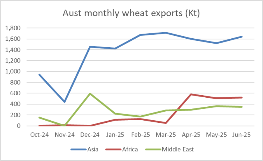 Australia shipped 2.54 million metric tonnes (MMT) of wheat in June, slightly down from the 2.59MMT in May. Indonesia was the largest destination with 649KMT which is the largest monthly shipments to them since Aug 2023. Philippines was the next largest with 328KMT. China was just 111KMT. Larger shipments into Africa and the Middle East is ensuring the export pace is maintained with 1.6MMT of wheat shipped to African countries from April to June and 1MMT to the Middle East. Asian exports have been holding around 1.5-1.7MMT/month. Barley exports remain strong with a further 800KMT shipped in June, just shy of the 845KMT in May. China made up 78% of the June exports with 622KMT followed by Japan with 152KMT.