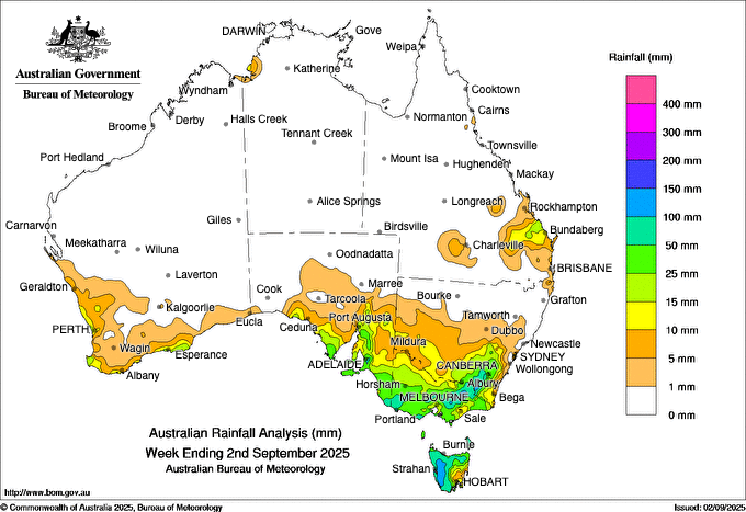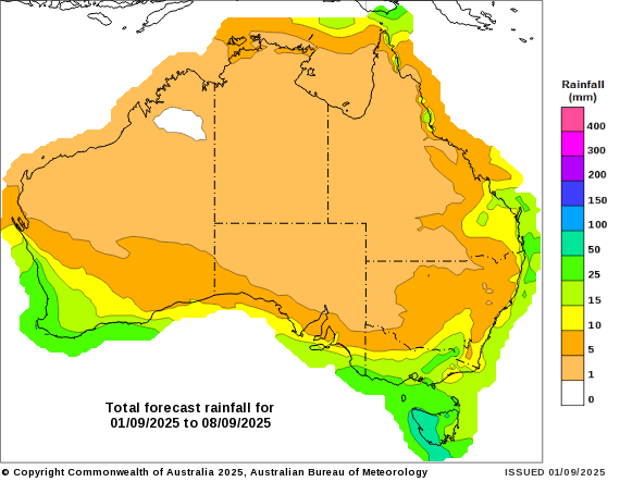 The current vegetation index continues to point towards another big wheat and barley crop in 2025/26. The rainfall averages of the Australian cropping zones have improved the NDVI ratings steadily improving through July and August following the late start. The next 10-14 days is again positive for rainfall in areas that need the additional moisture.