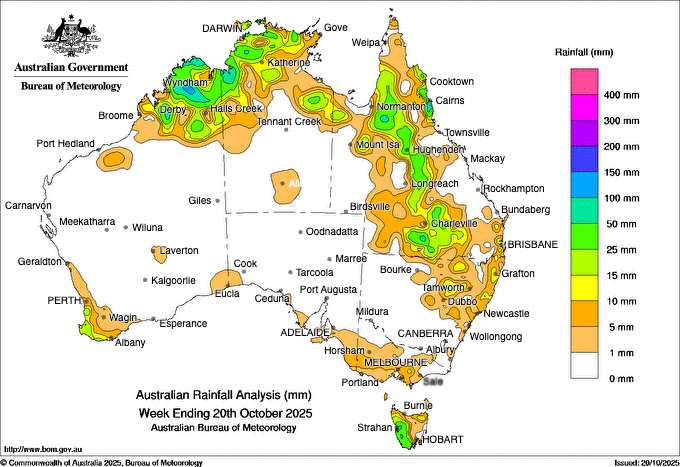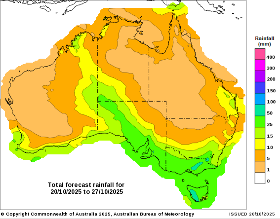 Local grain prices pushed higher last week aided by the weak Australian dollar, yield punishing weather across southeastern Australia and slow farmer selling. Traders are reporting that wheat is difficult to buy in Southern Queensland (QLD) and Northern New South Wales (NSW) where farmers are holding out for higher prices. We see the sharp increase in the wheat prices across NSW and Victoria (VIC) as the bulk handlers’ attempt to draw wheat into up-country storages. The market is reporting that wheat and barley old crop offers have dried up across Southeast Australia, making it virtually impossible to cover old crop positions (Nov/Dec). Western Australia (WA) wheat bids were generally a couple of dollars firmer, helped by the void of farmer selling on the east coast. The market is very much in flux with weather and the north and south moisture levels as the 2025/2026 harvest gets underway.
